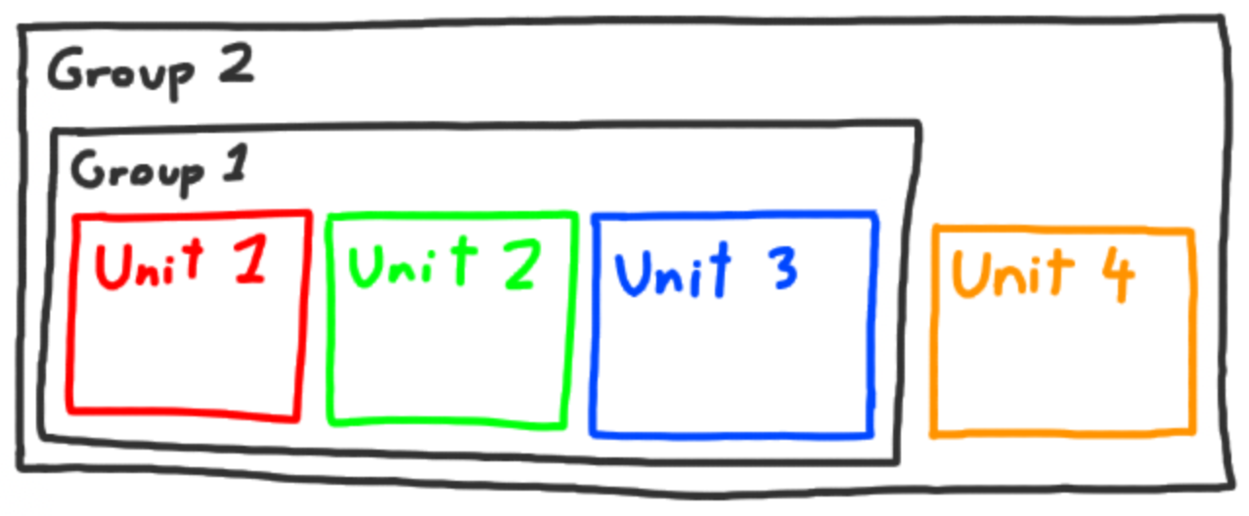 There are Units and there are Groups. Units are placed within groups, which themselves can be placed within other groups. In this way we can lay out collections of units and divide them up by purpose or whatever we like.