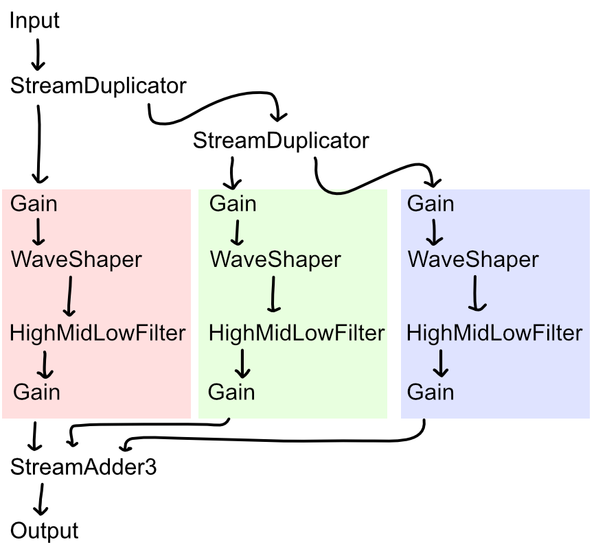 In this tutorial we will be building a unit which uses the audio engine. Its going to be a three-band distortion filter. The idea being that we want to be able to apply distortion to the High, Mid and Low frequency bands.