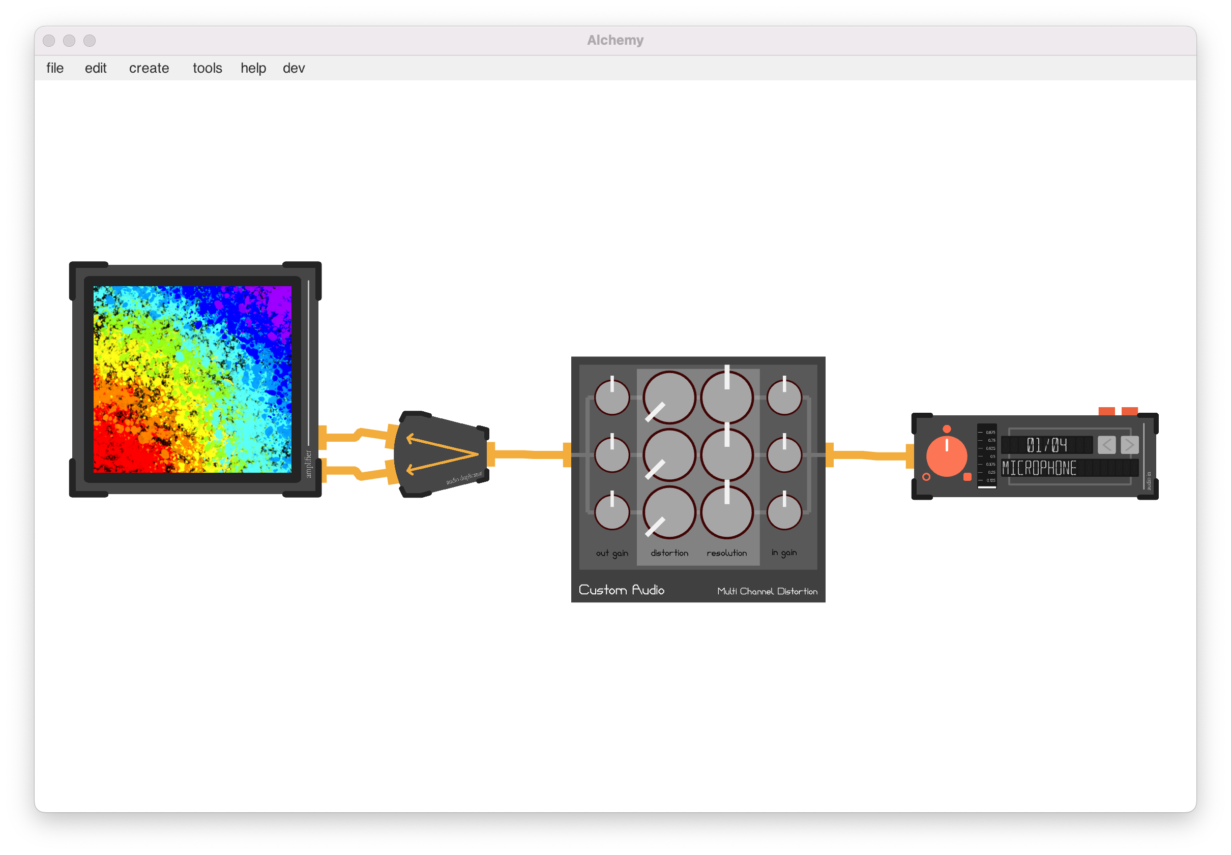 Congratulations! You've just created a new unit which uses the audio engine. You can now play around with it in whatever way you like. Personally, I find it sounds great as a distortion box for an electric guitar. Having the ability to chose how much distortion I have for High or Low frequencies really gives lots of freedom in what sounds you can create.